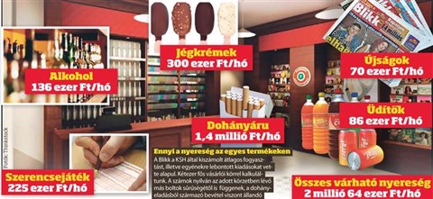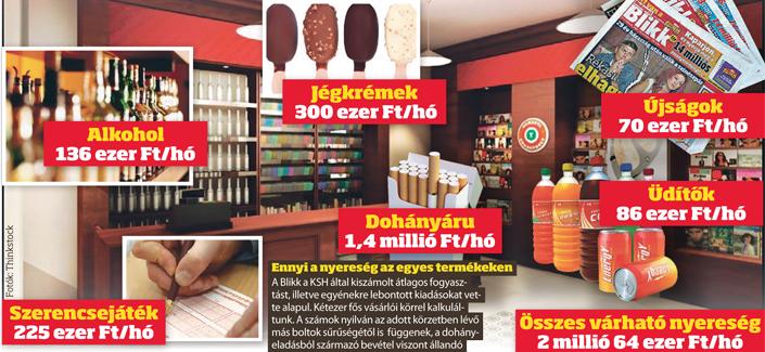 Azt alapul véve, hogy kétezer emberre ír elő a törvény egy nemzeti dohányboltot, a Blikk osztott-szorzott: ez körülbelül mekkora haszonnal kecsegtethet. Az egészségügyi mutatók szerint a felnőtt népesség harmada dohányzik, ez tehát hatszáz kuncsaft a vevőkörből. Amennyiben mindannyian naponta egy doboz cigarettát vesznek 800 forintért, azon havonta csaknem másfél milliós profitja keletkezik a trafikosnak – szemben a 4 százalékos árrés melletti bő félmillióval. Ha ehhez hozzávesszük a hazai éves jégkrém- vagy üdítőfogyasztásunkból kikalkulált körülbelüli profitot: busásan meg lehet élni belőle. Pláne, ha egy kézben több trafik is van.