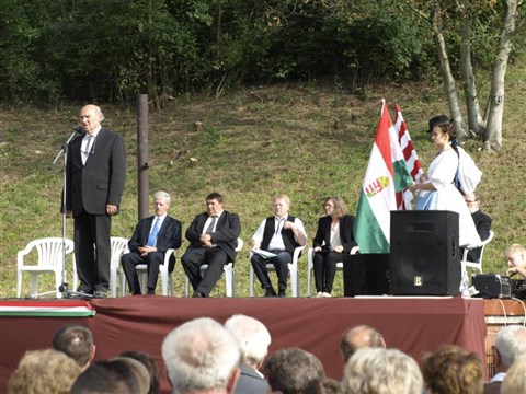 A Kishegy alatti szabadtéri színpad díszletét a négy, palóc népviseletbe öltözött fiatal tartotta piros-fehér-zöld, Árpád-házi, székely lobogók, és a Magyarok Világszövetségének zászlaja adta. A rendezvényt Bottyán Zoltán, az MVSZ Kárpát-medencei Térségének alelnöke, az MVSZ Pásztói Csoportjának vezetője nyitotta meg. Első gondolatai a július utolsó napjaiban, a Fogadalmi Hely végső kialakításakor tragikus körülmények között elhunyt Gortva Jánost idézték, akiről a mintegy háromszáz részvevő egyperces néma csenddel emlékezett meg. (A képen: Bottyán Zoltán megnyitó beszédét mondja. Tőle jobbra: Sisák Imre, Becsó Zsolt és Patrubány Miklós, valamint dr. Szabó Irén és Réti Árpád versmondók.)