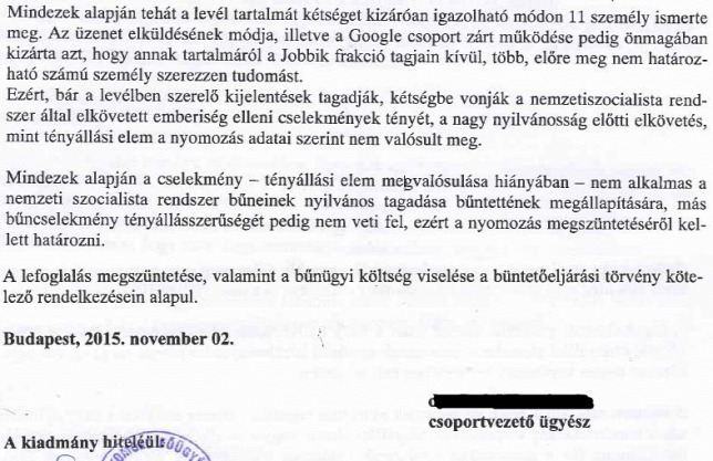 A nyomozás azt is megállapította - derült ki az ügyészség nyomozást megszüntető határozatából -, hogy "a levél támájából és címzettjeiből (a Jobbik-frakció tagiai) arra lehet következtetni, hogy a közlés célja "nem a holokauszttal mint történelmi eseménnyel kapcsolatos nézetek terjesztése, hanem az országgyűlési emléknappal kapcsolatos frakcióálláspont megvitatása, kialakítása volt."