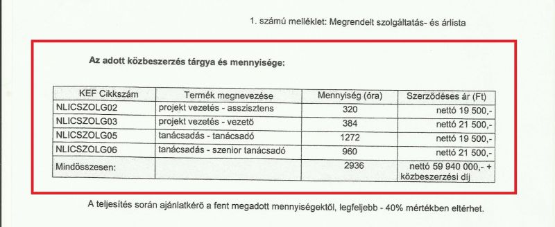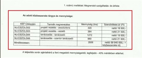 A cég elég komoly óradíjat számított fel; a projekt vezetője és a senior tanácsadó nettó 21.500, a tanácsadó és az asszisztens 19.500 forintért dolgozott óránként.