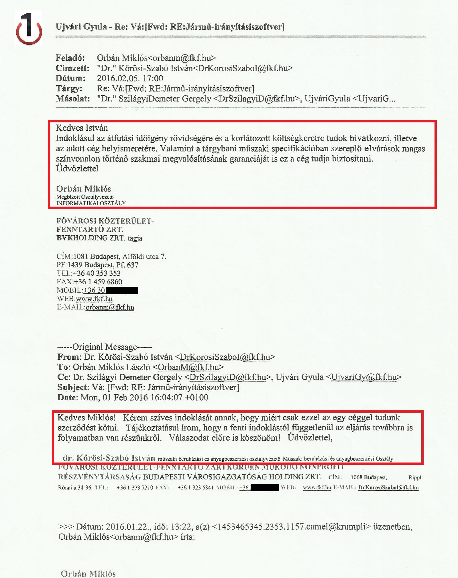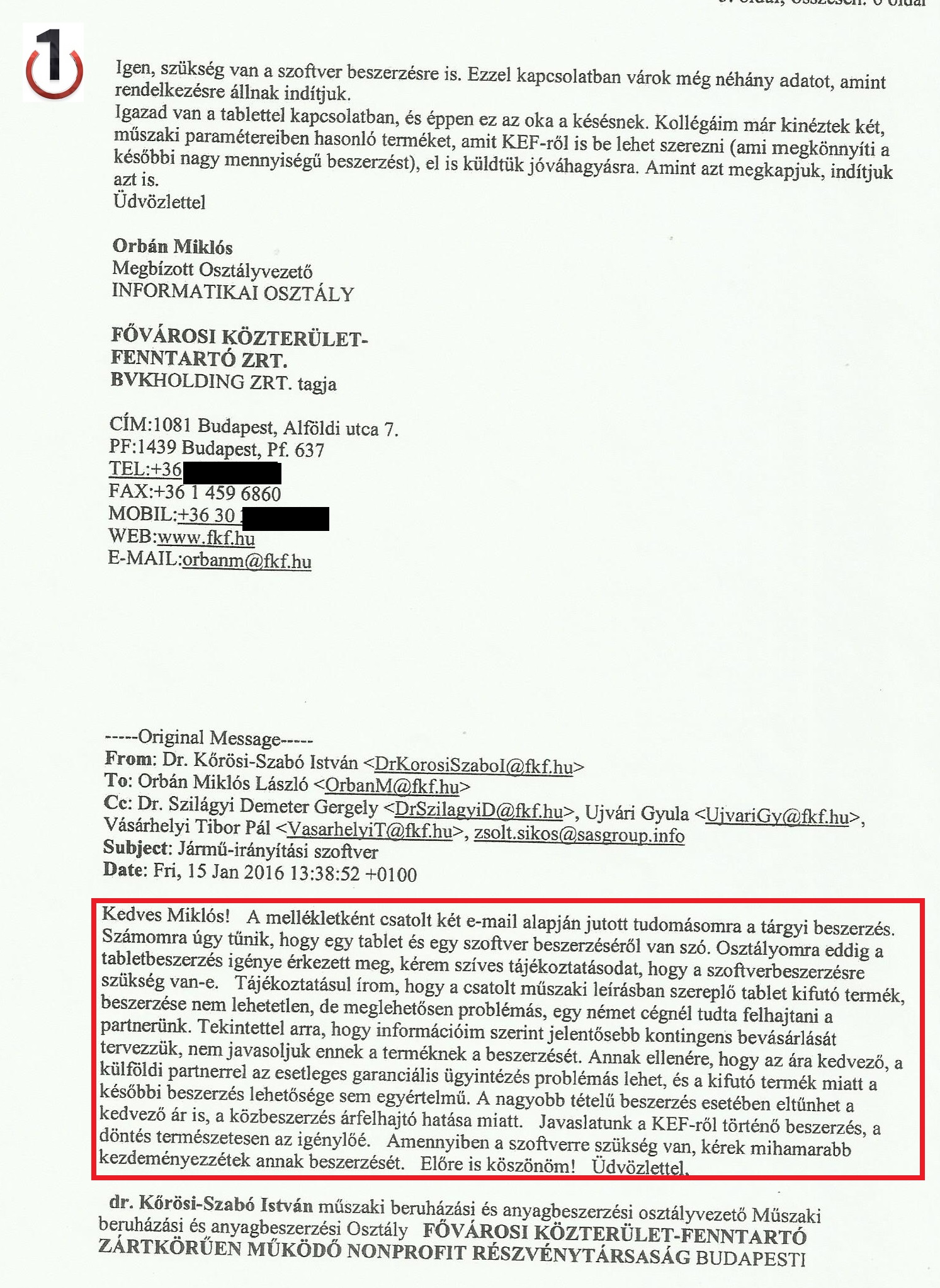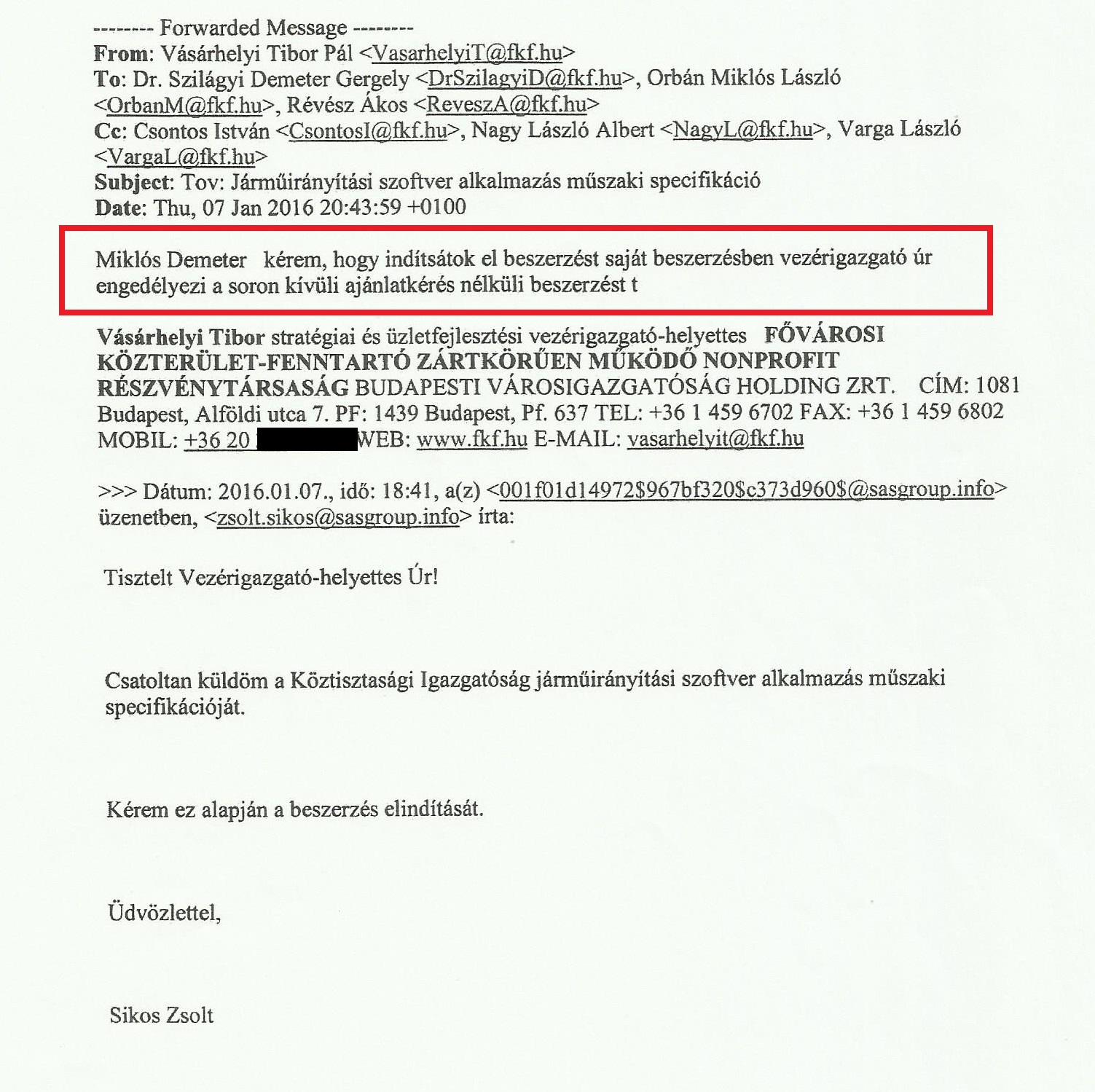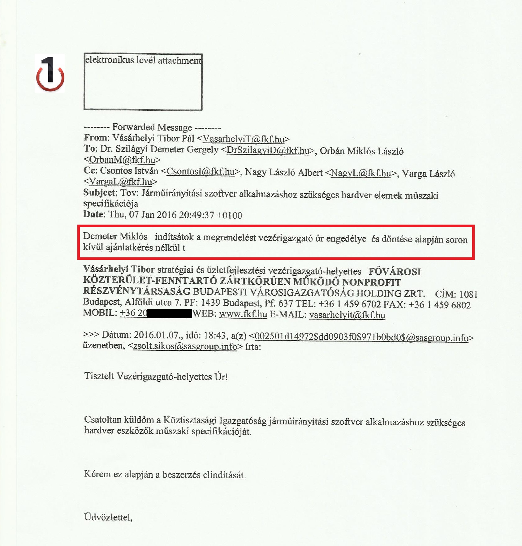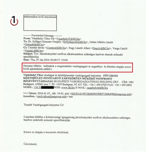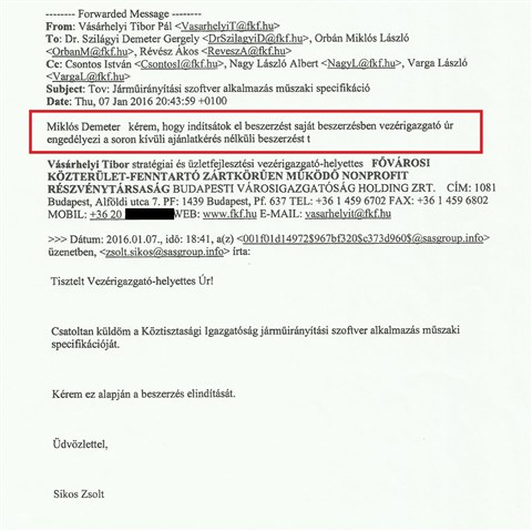 Az N1 birtokába került belső levelezés szerint Sikos Zsolt január 7-én már azzal kereste Vásárhelyi Tibor vezérigazgató-helyettest, hogy küldi a szoftverhez szükséges hardvereszközök és a szoftver műszaki specifikációját. Vásárhelyi még aznap felszólítja a beszerzési igazgatót, Szilágyi Demetert és az informatikai osztály vezetőjét, Orbán Miklóst, hogy indítsák el a megrendelést. Mint írja: „vezérigazgató úr engedélyezi a soron kívüli, ajánlatkérés nélküli beszerzést.”