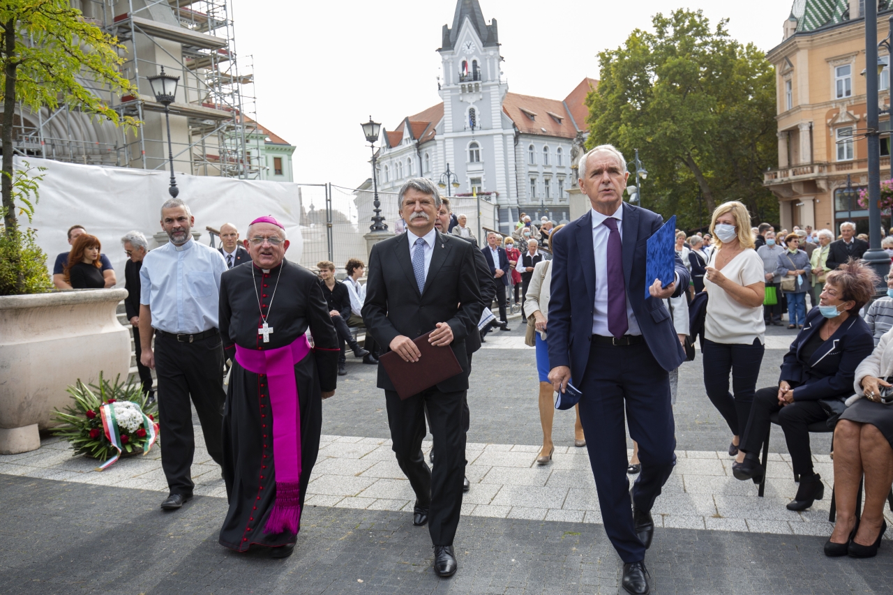 Kövér László, az Országgyűlés elnöke a város Kossuth terén, Párkányi Raab Péter szobrászművész alkotásánál hangsúlyozta: Márton Áron ember- és nemzettársainak, híveinek reménységet nyújtott a reménytelenségben, emberséget az embertelenségben, hitet a hitetlenségben, magyarságot a magyarellenességben, székely öntudatot az árvaságban, és tetteivel visszaadta a szavak magyar értelmét, erkölcsi súlyát, valamint emberi hitelét.