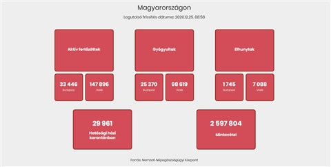 Az elhunytak száma 8833, a gyógyultaké 123 989. Az aktív fertőzöttek száma 181 342. Az aktív fertőzöttek 18 százaléka, az elhunytak 20 százaléka, a gyógyultak 20 százaléka budapesti. Kórházban 6006 koronavírusos beteget ápolnak, közülük 489-en vannak lélegeztetőgépen. Hatósági házi karanténban 29 961-en vannak, a mintavételek száma 2 597 804-re emelkedett.