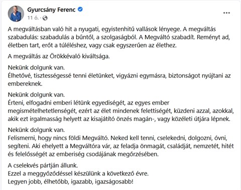 "Aki a Megváltóra vár, az feladja önmagát" - írja Facebook-bejegyzésében Gyurcsány Ferenc. Bár a volt miniszterelnök földi megváltóról ír, Maimonidésszel és sok sok más zsidó hitével mégsem teljesen kompatibilis ez a gondolat, ezért így az év végén mosolyt csalt az arcunkra az aktuális okoskodása.