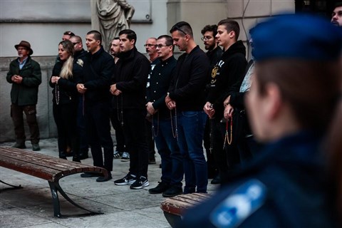 Eljött tehát a kedd délután, Hadházy újra az utcára hívta híveit, újra a Ferenciek terére, bár elméletileg megállapodás született, hogy ez lesz az utolsó alkalom ott. Következő alkalommal némileg odébb mentek... Megjelent tehát legalább 40-50 keresztény és nemzeti érzelmű magyar, különféle szervezetek tagjai, vagy éppen szervezet nélküliek, nem ez volt a lényeg. Hanem a kiállás ezredéves értékeink, hagyományaink, a hitünk mellett. Rózsafüzért imádkoztunk végig, az újbolsevik tömegből senki nem tudott így a templom közelébe jönni.