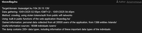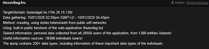 A honlapon szereplő információk szerint október elsején a Tisza Világ alkalmazás „beépített publikus funkcióin” keresztül valakinek sikerült kinyernie több mint 18 ezer felhasználó adatait, amit feltöltöttek az internetre. A hatalmas mennyiségű személyes adat között olyan információk szerepelnek, mint a felhasználók neve, anyja neve, lakcíme, e-mail címe és telefonszáma. Sőt, az érintettek tényleges tartózkodási helye is nyilvánosságra került, valamint az is megtalálható a felületen, hogy melyik egyéni választókerületbe tartoznak az adatszivárgás áldozatai.