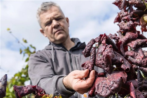 ![]() Aranyszínű sárgasággal fertőzött szőlőt mutat Tarsoly Róbert egy Zalaszentgrót környékén fekvő ültetvényen 2025. október 1-jén (fotó: Katona Tibor / MTI) |