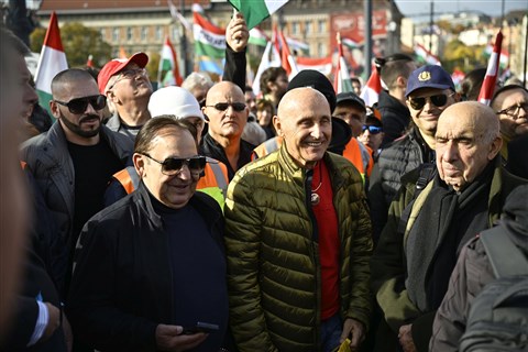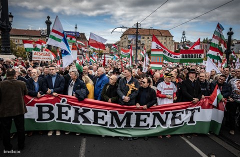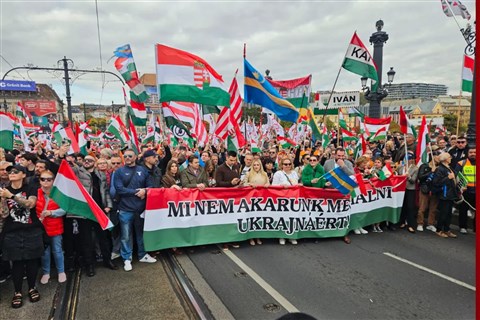 A Margit hídon vonulnak a Békemenet résztvevői, a tömeg elején nemzeti színű zászlókat visznek, az egyiken Békemenet, a másikon „Mi nem akarunk meghalni Ukrajnáért” felirattal.