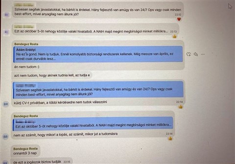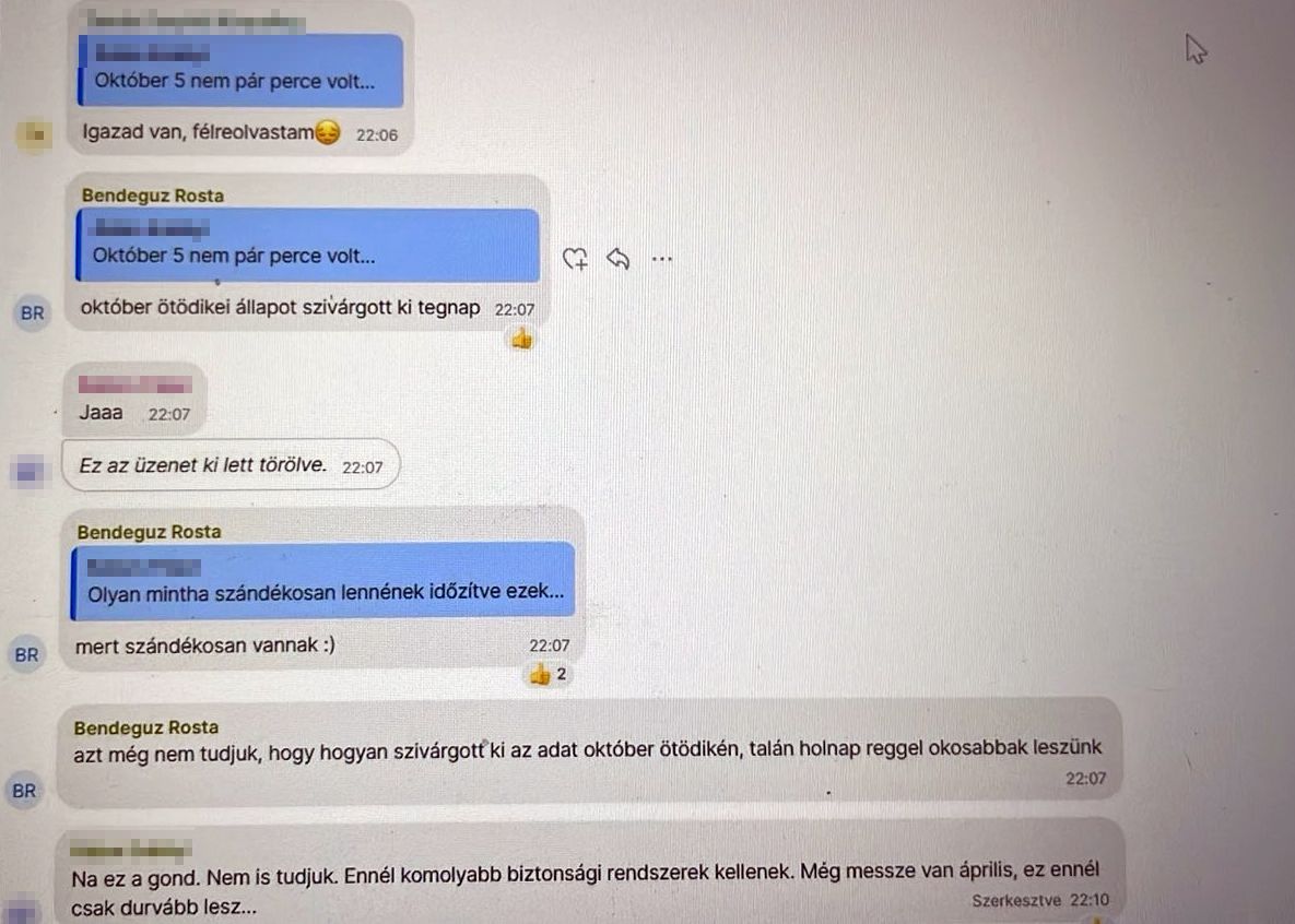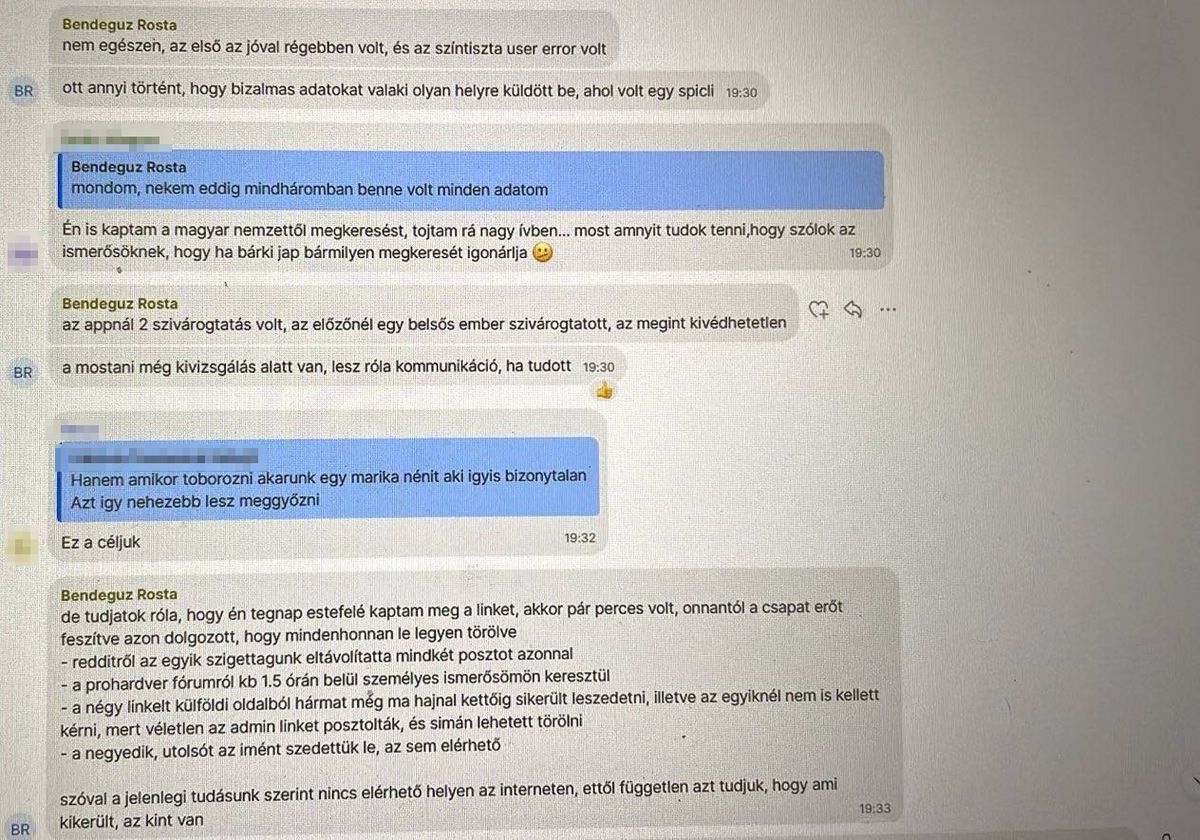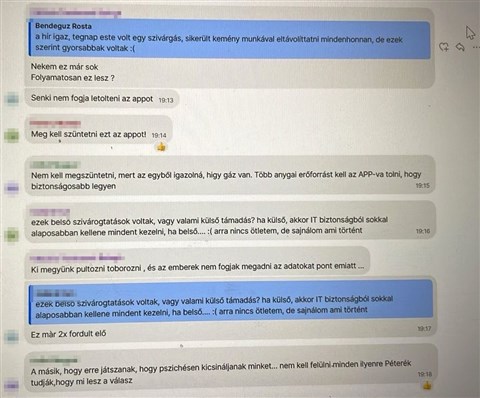 A beszélgetésben Rosta Bendegúz leírja, hogy az adatszivárgásról szóló hír igaz, a tagok pedig felvetik, hogy meg kellene szüntetni az applikációt. Egyvalaki azonban felhívta rá a figyelmet, ha így tennének, „az egyből igazolná, hogy gáz van”. Megkérdezték, hogy belső szivárogtatásról vagy külső támadásról van-e szó, az informatikus azonban annyit közölt, hogy egyelőre vizsgálják a történteket. A lap rámutat, így tehát még vasárnap sem tudhatták biztosan, Magyar Péter mégis orosz hekkertámadásról beszélt.