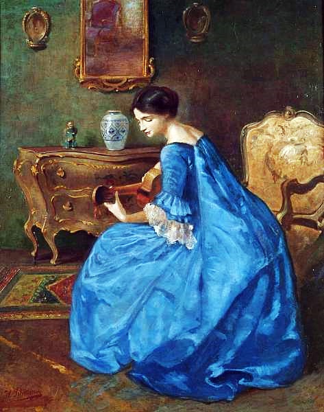 Schramm Németországban ecsetével, ceruzájával megörökítette a felső-középosztály mindennapjait, betekintést enged elegáns enteriőrjeikbe, a polgári szalonokba, megörökítette az ottani bútorzatot. És főleg festette az elegáns, ruhakölteményekbe öltözött gyönyörű, fiatal hölgyeket. Az alkotó megragadta és ecsetével megjelenítette a drága ruhaanyagok textúráját, azoknak fényét, a selyem felett a színek játékát.