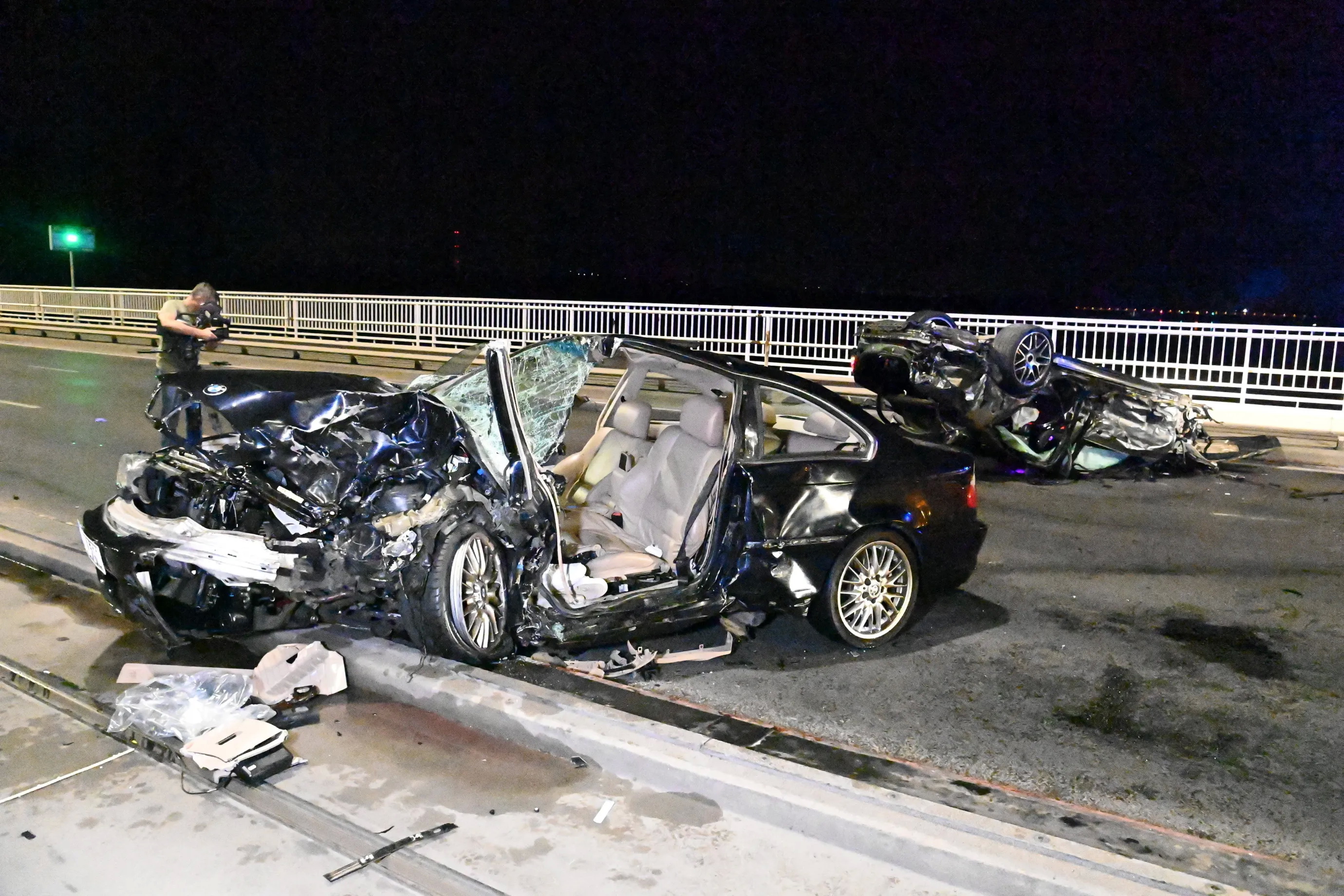 ![]() Ütközésben összeroncsolódott személygépkocsik az Árpád hídon 2023. július 1-jén (fotó: Mihádák Zoltán / MTI) |