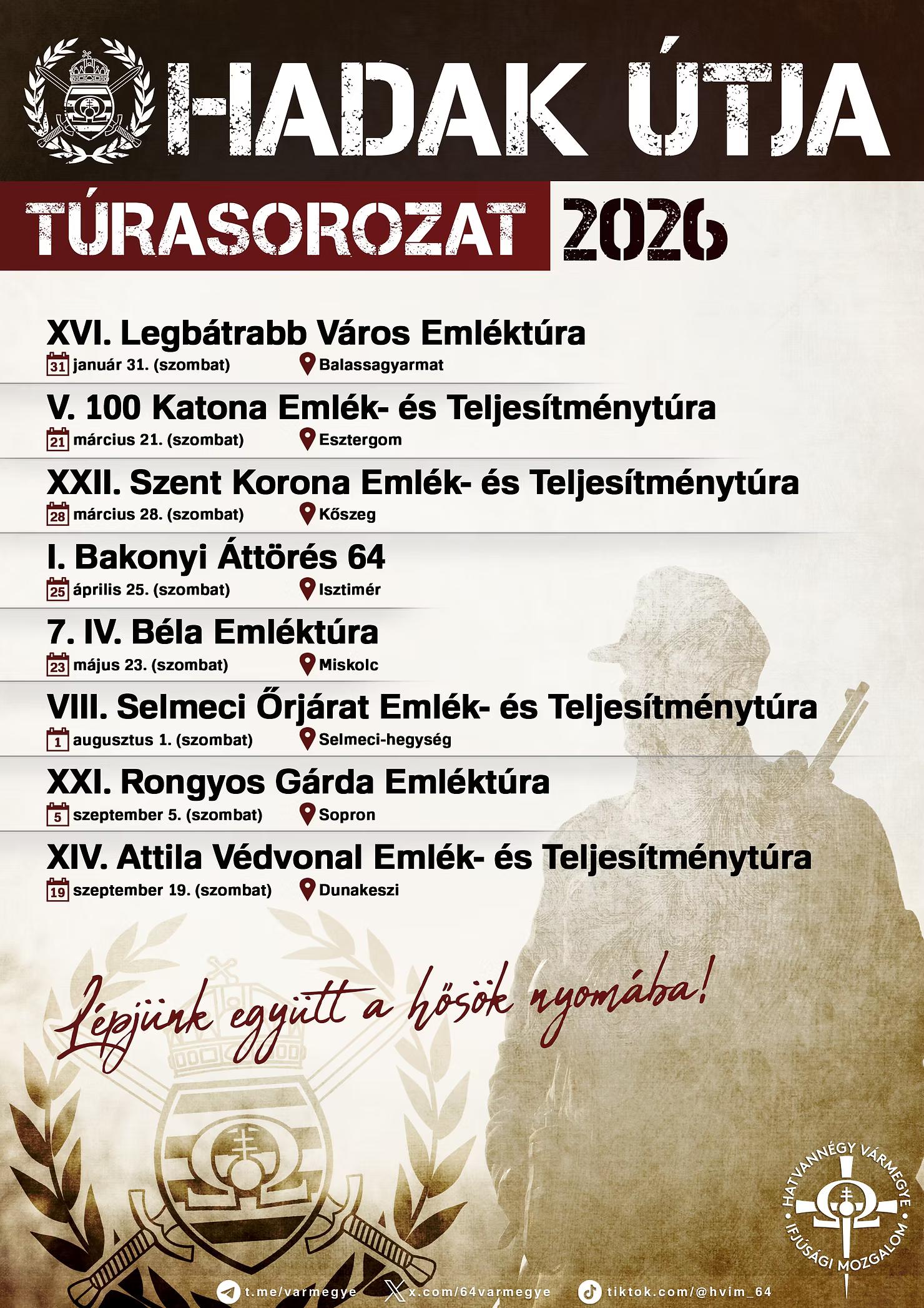Ahogyan azt megszokhattátok, mindig tartogatunk számotokra valami újat, jobbat az előzőekhez képest. 2026-ban sem lesz ez másképp: egész évben azon dolgoztunk, hogy profi szintre emeljük a két éve felélesztett Hadak Útja túrasorozatot. Folyamatosan figyeljük a túrázók igényeit, és törekszünk egy olyan koncepcióra, amely komfortosabbá teszi a túrasorozaton való részvételt, ugyanakkor nem engedünk a kitűzött célból: méltónak maradni a hősök szelleméhez.