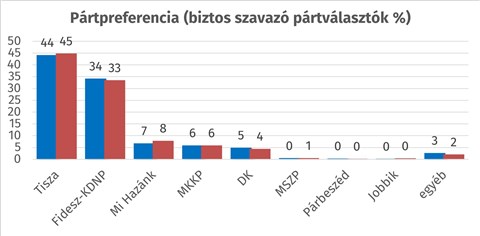 Az egyetlen szemmel látható, bár hibahatáron belüli változás a biztos szavazó pártválasztók körében történt: a Tisza itt 1 százalékpontot erősödött, 45 százalékra, a Fidesz–KDNP pedig 1 százalékponttal esett vissza, 33 százalékra. A különbség így 12 százalékpont a Tisza javára a biztos szavazók körében.