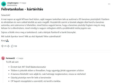 A sofőr beszámolója szerint sima 95-ös benzint szeretett volna tankolni, és egészen biztos benne, hogy nem cserélte fel a töltőpisztolyokat, mivel erre külön ügyelt. Ennek ellenére az autója kicsivel később leállt. Nincs egyedül: egy másik felhasználó szerint szerda este legalább két másik autó is lerobbant, miután az említett kútnál tankoltak.