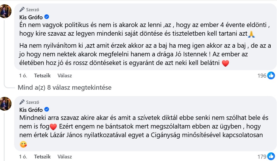A hozzászólások között többen is írtak arról, hogy Kis Grófó korábban nyíltan szimpatizált a kormánnyal, amire a "zenész" úgy reagált, hogy: