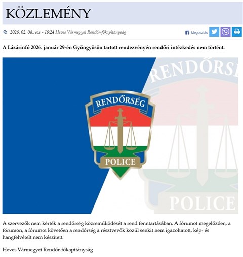 Lázár János állításaival szemben senkit sem igazoltattak a rendőrök a botrányba fulladt, gyöngyösi Lázárinfót követően, a rendezvényen a szervezők nem kérték a rendőrség közreműködését a rend fenntartásában – közölte a Heves Vármegyei Rendőr-főkapitányság.