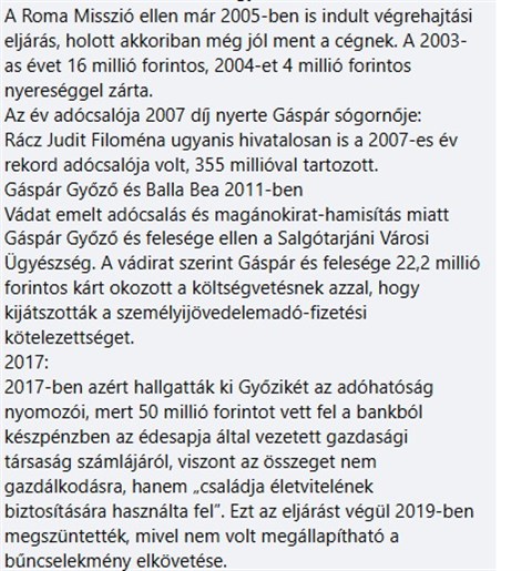 2009 körül került nyilvánosságra, hogy idősebb Gáspár Győzőhöz köthető Roma Misszió alapítvány jelentős, mintegy 258 millió forintos adótartozást halmozott fel. Korábban, 2007-ben a bíróság pénzbüntetést szabott ki rá adózással kapcsolatos ügyben. A sajtó akkori beszámolói szerint a tartozást később rendezték. A Roma Misszió ellen már 2005-ben is indult végrehajtási eljárás, noha a szervezet korábban nyereséges éveket zárt.