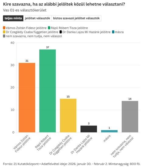 Múlt pénteken két választókerületi közvélemény-kutatás is megjelent. A 21 Kutatóközpont felmérése szerint a Tisza Párt jelöltje hibahatárt meghaladó különbséggel vezet a választókerületben. A teljes mintában 6, a jelöltet választók körében 7 százalékpontos előnye van Rápli Róbertnek a fideszes jelölttel szemben. Czeglédy 15, illetve 17 százalékponton áll a január 30 és február 2. között készült felmérésben.