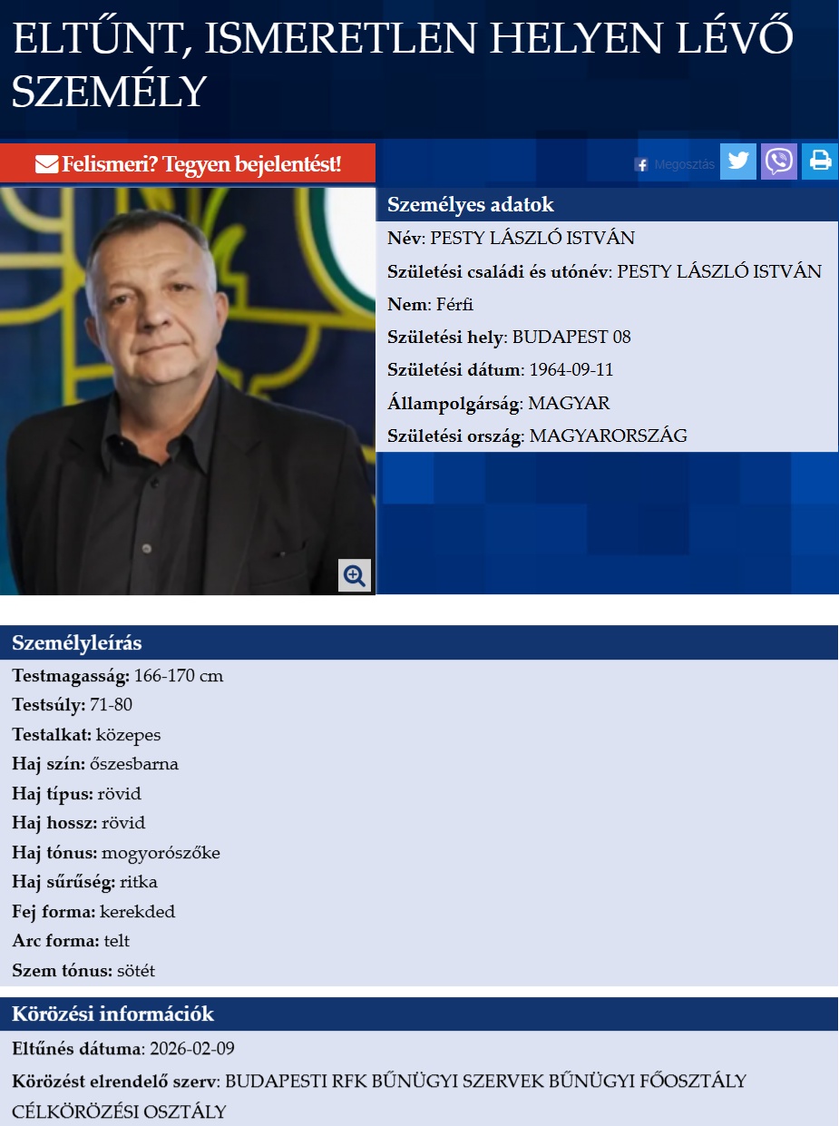 A múlt héten, február 9-én veszett nyoma Pesty Lászlónak, akit azóta eltűntként tartanak számon a hatóságok, Budapest I. Kerületi Rendőrkapitánysága pedig azóta is körözést folytat az ügyben.