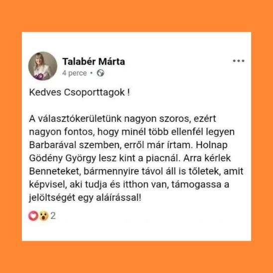 Ám 2026-ban vagyunk, hat évvel később. A másik képen az látható, hogy Talabér már arra buzdítja a fideszeseket, hogy írjanak alá a városba látogató Gődénynek, hogy minél több ellenfél legyen a „szoros választókerületben”.