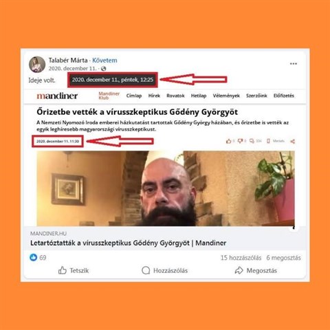 A Covid idején a Nemzeti Nyomozó Iroda emberei házkutatást tartottak a „vírusszkeptikus” Gődény Györgynél, majd őrizetbe is vették, amint arról a mellékelt ábra szerint a Mandiner is beszámolt. Ezt mély egyetértésben Talabér is kiposztolta, meglehetősen gyors tempóban.
