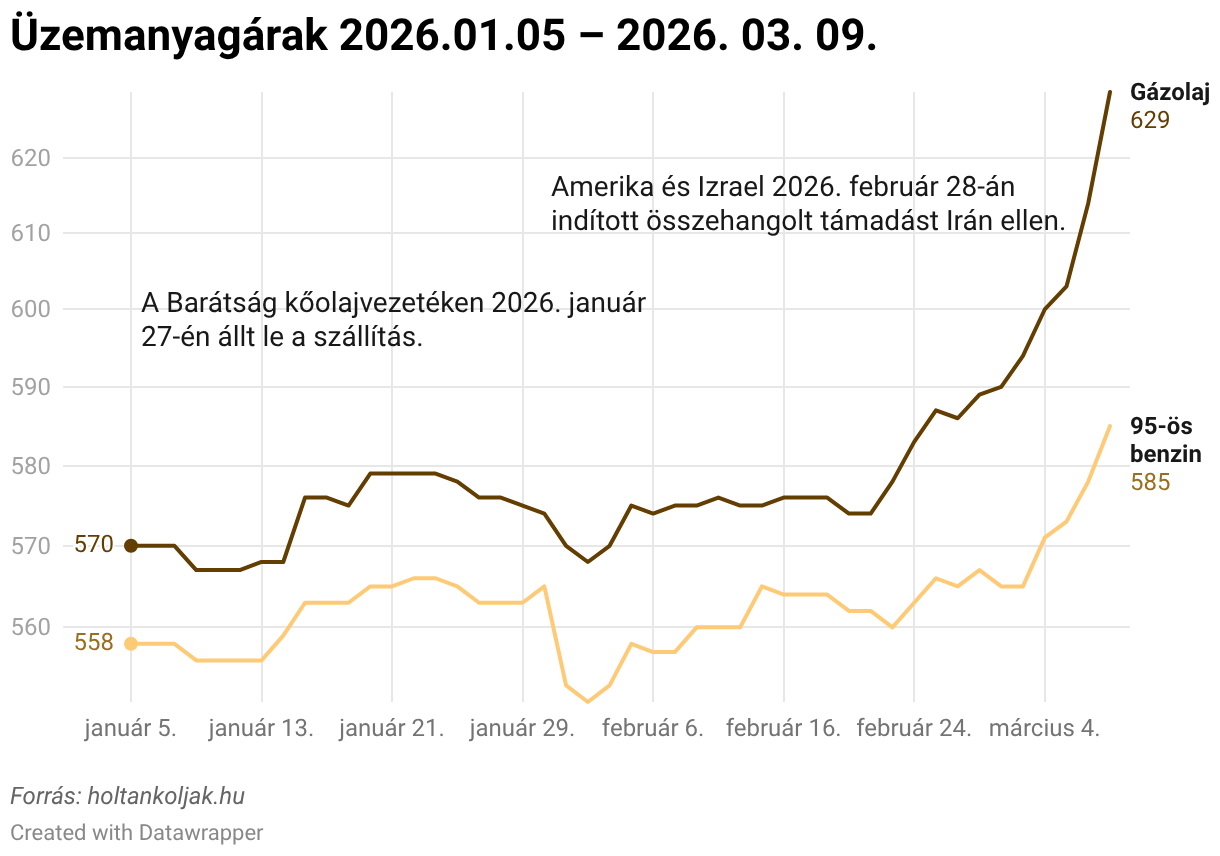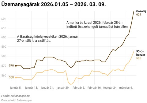 A 95-ös benzin ára február közepi, körülbelül 564 forintos szintről március 9-re 585 forintra emelkedett, ami több mint húszforintos növekedést jelent. A gázolaj esetében még erőteljesebb volt a reakció: a február közepi nagyjából 576 forintos szintről 629 forintra ugrott az ár, vagyis több mint ötven forinttal drágult literenként.