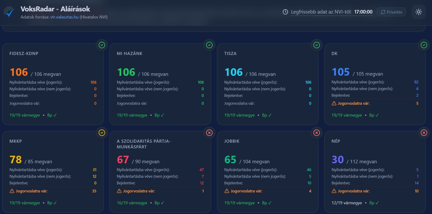 A Szolidaritás-Munkáspárt, a Jobbik és a Gődény-féle Normális Élet Pártja ajánlásait még ellenőrzik, de az már biztos, hogy 71-nél kevesebb egyéni jelöltjük lesz. Előbbi kettő jelenleg 55 jelölttel rendelkezik biztosan, utóbbi pedig mindössze 16-tal.
