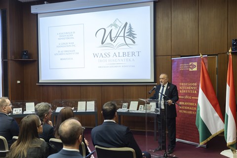 ![]() Takaró Mihály irodalomtörténész beszédet mond Wass Albert teljes írói hagyatéka Magyarországra érkezése alakalmából tartott sajtótájékoztatón az Országos Széchényi Könyvtárban 2026. március 18-án |