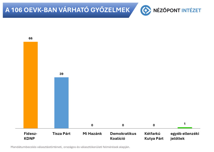 Összességében tehát a Fidesz-KDNP 66, a Tisza Párt 39 választókerületben bízhat a jelöltjei győzelmében, további egy választókerületben pedig más, Tisza-közeli ellenzéki jelölt kerülhet az első helyre - közölte a Nézőpont.