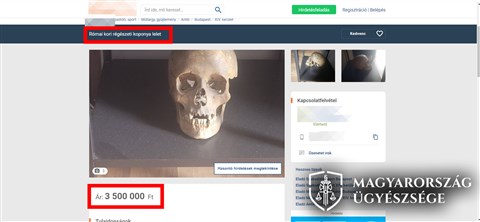 A hirdetés miatt egy régészhallgató tett bejelentést a rendőrségen, amelynek nyomán a fővárosi nyomozók a lakásban megtalálták és lefoglalták a koponyát.