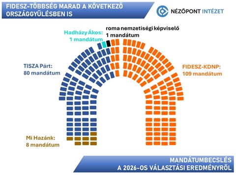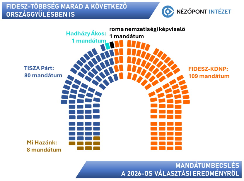 Nagy valószínűséggel állítható, hogy a Fidesz-KDNP a következő országgyűlésben is megszerzi a mandátumok abszolút többségét, várhatóan 199-ből 109-et, és így Orbán Viktor marad Magyarország miniszterelnöke a 2026-os választás után is. A Tisza Pártnak Hadházy Ákossal együtt 81, a Mi Hazánknak pedig 8 képviselője lehet. A 199. mandátum a "roma" nemzetiségi listához kerülhet - írja szerkesztőségünkhöz is eljuttatott közleményében a Nézőpont Intézet.