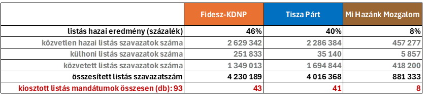 A fenti becslések eredménye alapján a pártlistás szavazatokkal megszerezhető 92 mandátum kiosztása is előrejelezhető. A választási rendszer ehhez az összes közvetlen és közvetett listás szavazat egész számokkal számított hányadosainak 92 legnagyobb értékének kiválasztását, a d’Hondt-eljárást alkalmazza. A fenti becslési eljárások alapján a Fidesz-lista esetében összesen 4 230 189 db, a Tisza-lista esetében 4 016 368 db, míg a Mi Hazánk listájánál 881 333 db, közvetlen és közvetett szavazatot vettek figyelembe. Így a Fidesz-KDNP listája 43, a Tisza listája 41, míg a Mi Hazánk listája 8 mandátumot szerezhet meg az összesen 92-ből.
