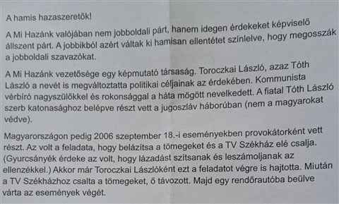 A lejárató szórólapon most pl. azt hazudják Toroczkai Lászlóról, hogy a szerb katonaság tagja volt, miközben épphogy a Fidesz szavazta le a Mi Hazánknak még az országgyűlési képviselők kettős állampolgárságának nyilvánosságát célzó javaslatát is.