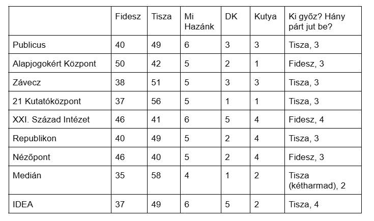 Kevéssel a választások előtt a szavazókorú népesség 48 százaléka készült arra, hogy a Tisza Pártra szavaz, 30 százalék a Fideszre, 4 százalék a Mi Hazánkra, 2 százalék a DK-ra, 1 százalék az MKKP-ra adná a voksát, 15 százalék nem tudott vagy nem akart válaszolni, illetve biztos volt abban, hogy nem fog szavazni.