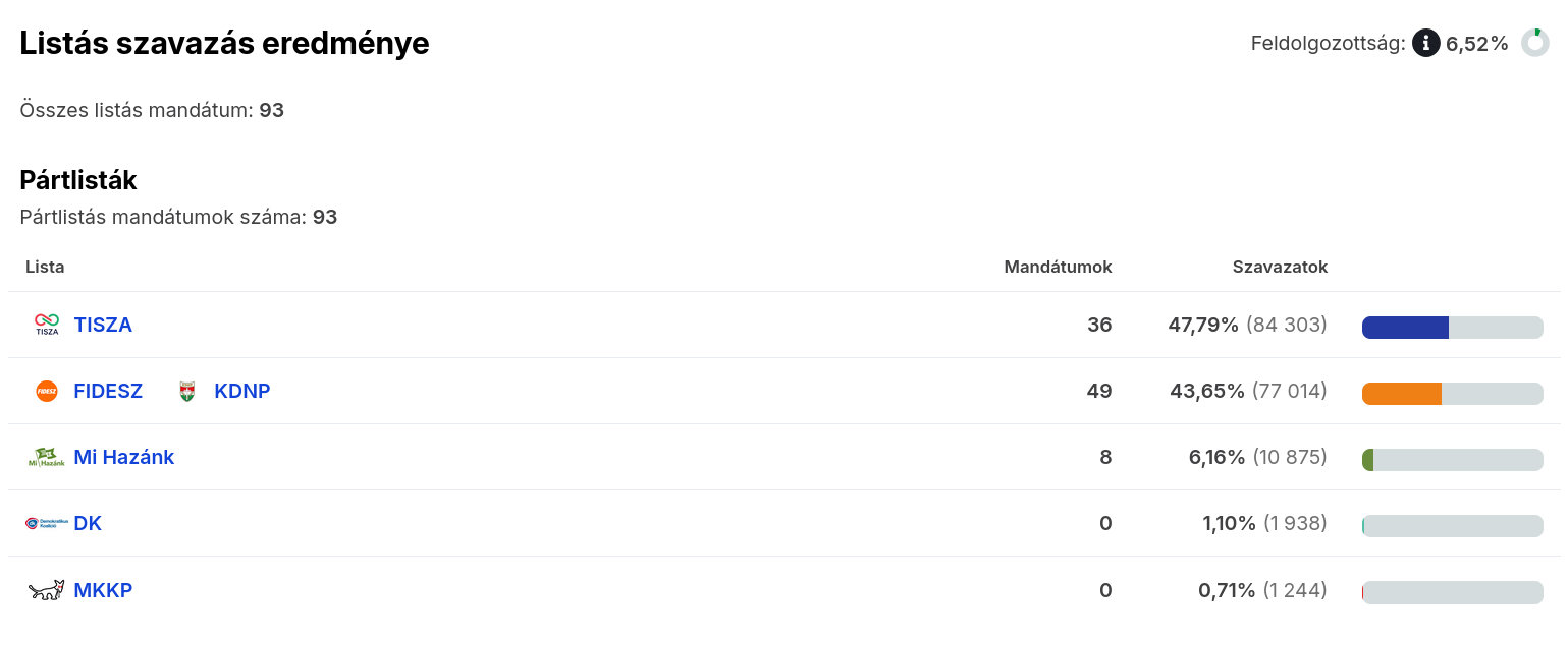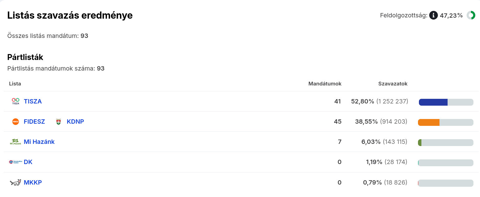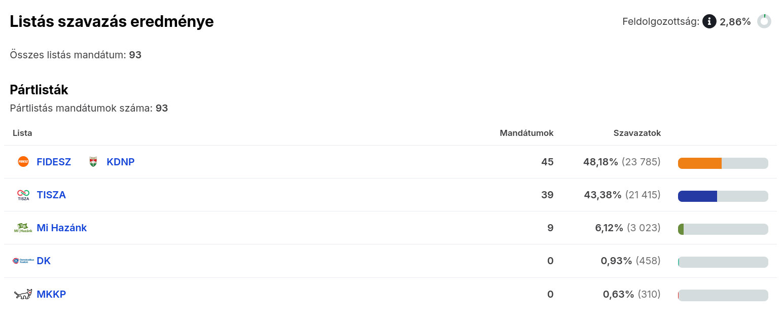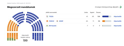 Az ábrák közötti feldolgozottság eltérő, illetve az egyéni képviselőknél való állás is számít, ezért ellent mondhatnak egymásnak. A nemzetiségi listák közül a cigányoké később érdekes lehet, de az ő mandátumokkal majd akkor számolnak, ha összeszámoltak kellő érvényes szavazatot.