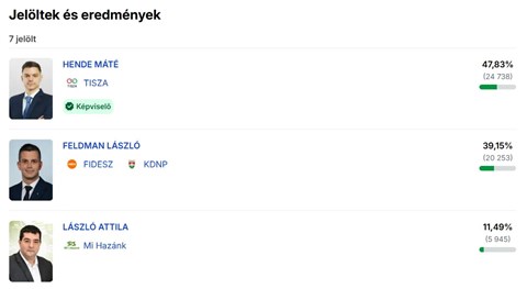 Mit jelent ez a gyakorlatban? Vegyük példának Pest vármegye 13. választókerületét, ahol a tiszás Hende Máté 47,83 százalékot (24 738 szavazat) kapott, a fideszes Feldman László 39,15 százalékot (20 253), a mi hazánkos László Attila pedig 11,49 százalékot (5945 szavazat).