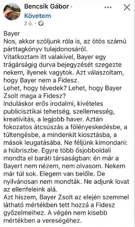 „Vitatkoztam itt valakivel, Bayer egy trágárságig durva bejegyzését szegezte nekem, ilyenek vagytok. Azt válaszoltam, hogy Bayer nem a Fidesz. Lehet, hogy tévedek Lehet, hogy Bayer Zsolt maga a Fidesz?” – tette fel a kérdést Bencsik Gábor, a Magyar Krónika főmunkatársa, a Magyar Demokrata újságírója a Facebookon, vette észre a Telex.