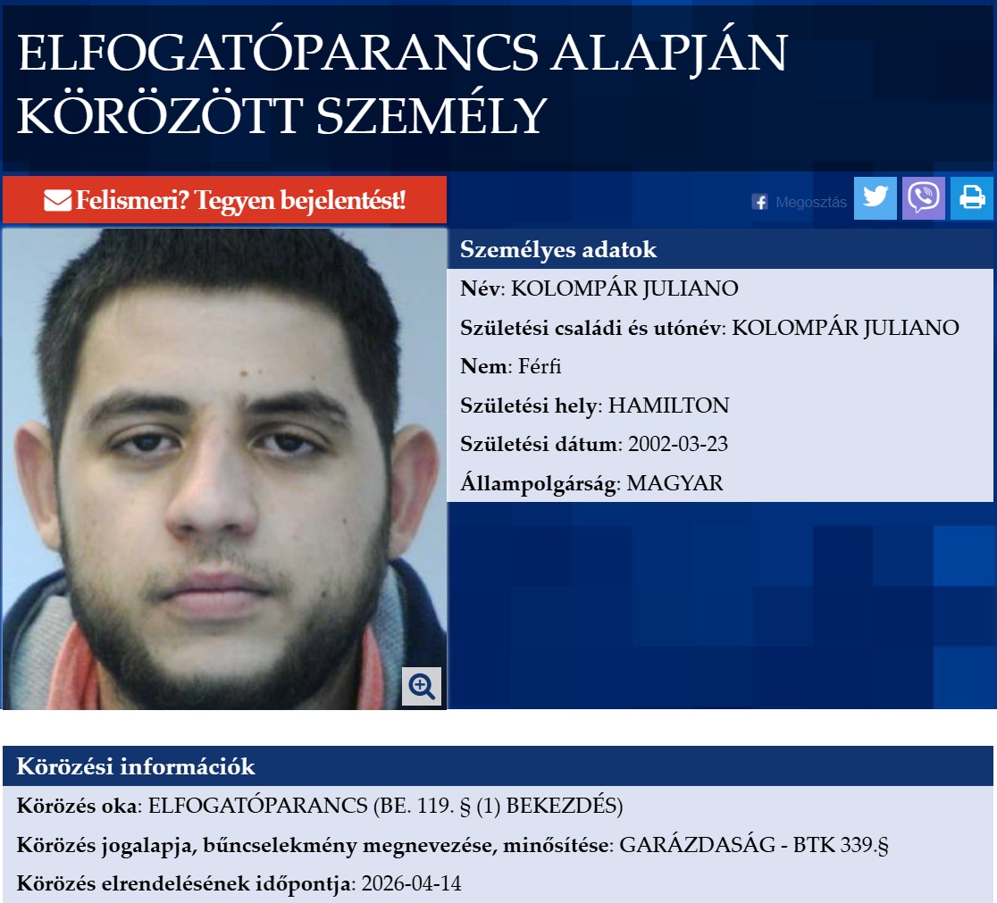 A Tapolcai Rendőrkapitányság Bűnügyi Osztálya körözést rendelt el a 24 éves Kolompár Juliano ellen. A Tapolcai Rendőrkapitányság büntetőeljárást folytat garázdaság miatt, melyben felmerült a gyanú, hogy a képen látható Kolompár Juliano követte el a cselekményt.