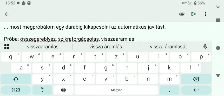 Tehát ha meg akarjuk neki tanítani, hogy találkozásaikat, de nincs kedvünk, nem akarunk ékezeteket írni, akkor beírjuk, hogy talalkozas, elfogadjuk az ékezetes verziót – iOS-en –, lenyomunk bármit, hogy megjelenjen a szóköz, azt kitöröljük, odaírjuk a szó végére, hogy -aikat, és elfogadjuk az új verziót, amit a Gboard megjegyez. Az egészben mindezen kívül még az is bosszantó, hogy ha be van kapcsolva a nyelvhelyesség-ellenőrzés, akkor a Gboard hibásként aláhúzza az általa nem ismert, de amúgy nyelvtanilag helyes szavakat.