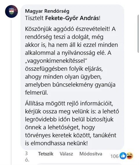 A rendőrség kommentben válaszolt Fekete-Győr Andrásnak, miután ő az országos rendőrfőkapitánynak címezve nyílt levelet tett közzé Facebook-oldalán, vette észre a Telex.