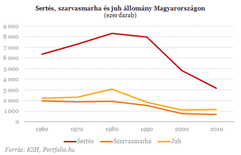 A sertések száma az elmúlt hat hónap alatt 3 százalékkal csökkent, számuk december 1-jén alig haladta meg a 3 milliót. Az állomány az egy évvel korábbinál 137 ezerrel (4 százalékkal) volt kisebb. A sertések száma az elmúlt tíz évben 3 és 5,3 millió között változott; 2008 decembere óta 3,5 millió alatti. Az anyakocák száma (210 ezer) egy év alatt 9 ezerrel csökkent.