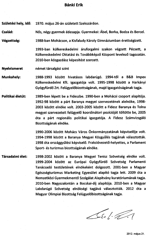 Az ellenzéki képviselő keddi budapesti sajtótájékoztatóján állításának alátámasztására a fideszes politikus országgyűlési honlapon közzétett önéletrajzait mutatta be. Mint elmondta: az egyik, a honlapra korábban feltett önéletrajza szerint Bánki Erik közgazdász diplomával rendelkezik, amelyet 2010-ben szerzett, a másik, módosított, 2012. május 21-i változat szerint közgazdász képesítése van, "amivel elismerte, hogy nincs diplomája".