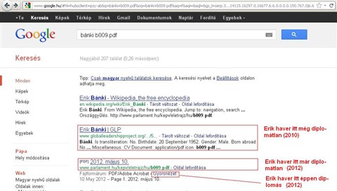 Csakhogy, ha beírjuk a Google-be, hogy "bánki b009.pdf", akkor kidobja a hamisított verziót, amiben bárki láthatja, hogy Erikünk "2010-ben közgazdász képesítést szerzett".