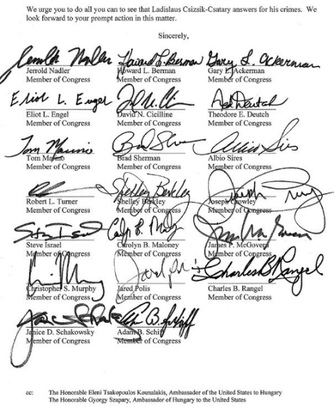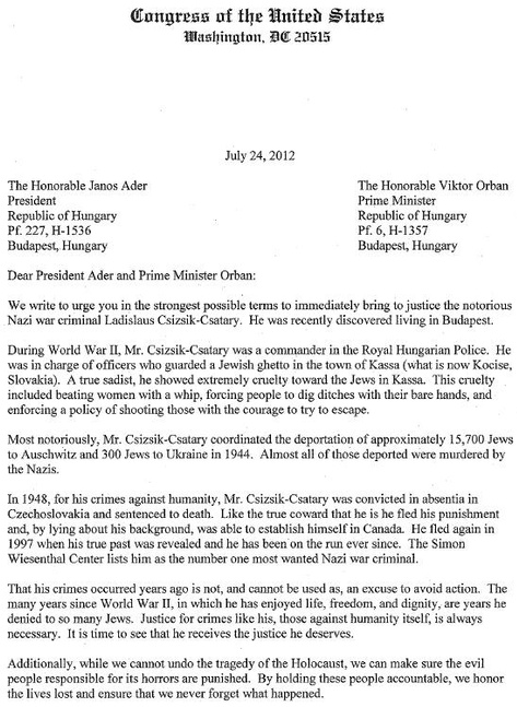 A csoport vezetője Jerrold Nadler New York-i demokrata képviselő, és az aláírók között mindkét párthoz tartozó politikusok megtalálhatók (olyan szép nevekkel, mint például Steve Israel vagy Theodore Deutsch). A levélírók "a lehető legnyomatékosabban” azt kérik a magyar vezetőktől, "tegyenek meg mindent annak érdekében, hogy "a hírhedt náci háborús bűnöst, Ladislaus Csizsik-Csatáryt” haladéktalanul felelősségre vonják Magyarországon, miután "nemrég a nyomára bukkantak Budapesten”.