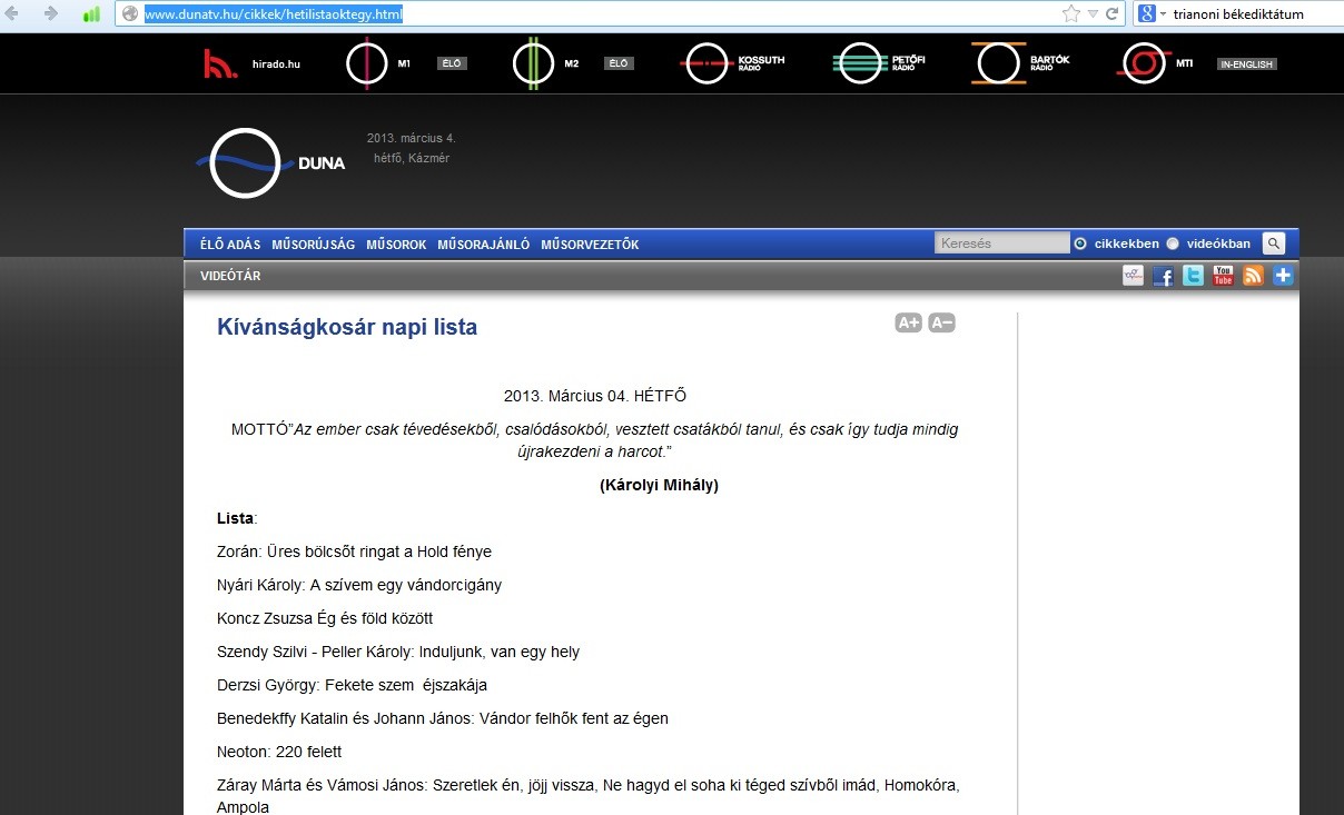 Olvasónk hívta fel a figyelmünket arra, hogy mivel kedveskedik a Duna TV az őket néző magyaroknak, akik közül sokan éppen Károlyiéknak köszönhetően élnek ma az ország jelenlegi határain kívül.