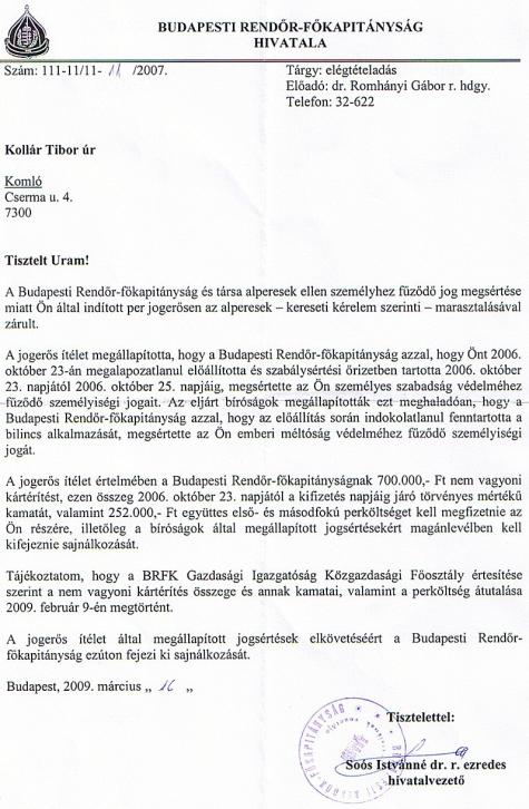 A jogerős ítéletben a pénzbeli marasztalás mellett bocsánatkérésre is kötelezték, mind az elsőrendű BRFK-t, mind a másodrendű Készenléti Rendőrséget (lánykori neve: REBISZ).