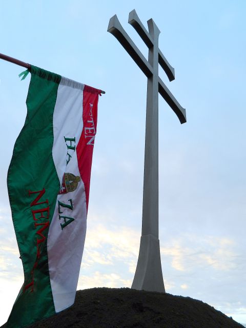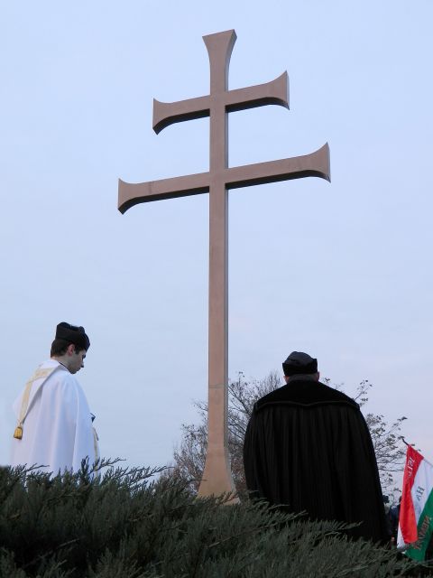 Az ünnepi beszédeket követően nagytiszteletű Hella Ferenc lelkész megáldotta, majd főtisztelendő Vajda Gábor káplán felszentelte a felállított kettős keresztet; végezetül a Jobbik koszorút, az ünneplők mécseseket helyeztek el a kereszt alatt.