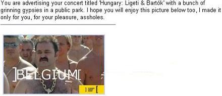 Olvasó: Ezt a javaslatot kapták (emailben) a belga zeneköcsögök (Flamand Rádiózenekar - a szerk.) pénteken, de még nem köszönték meg, valószínűleg elájultak a gyönyörtől.