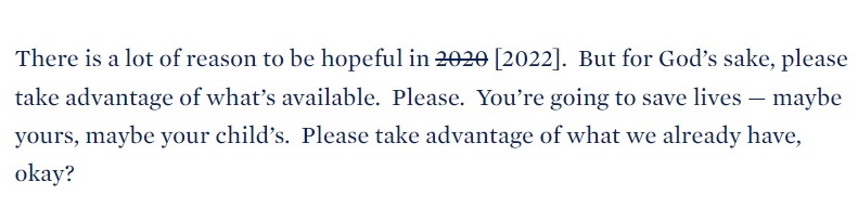 Sok okunk van reménykedni 2020-ban. De az Isten szerelmére, kérjük, használják ki, ami rendelkezésre áll (itt az oltásokra gondolt – a szerk.). Kérem. Életeket fog menteni – talán a sajátját, talán a gyermeke életét. Kérem, használja ki azt, amink már van.