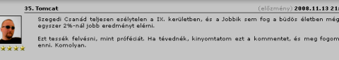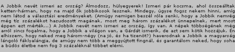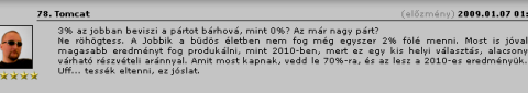 "A Jobbik nevét ismeri az ország? Álmodozz, hülyegyerek! Ismeri pár kocsma, ahol összeálltak ketten-hárman, hogy na majd ők jobbikosok lesznek. Mindegy, úgyse fogsz nekem hinni, amíg nem látod a választási eredményeket. (Amúgy nemigen beszél róla senki, hogy a Jobbik nemrég még tíz százalékot hazudozott magának, most meg három százalékot ünnepelnek, mert most éppen ezt mérték...) A Jobbik nevét nem ismeri az ország, így van. A népek többségének még arról sincs fogalma, hogy a Jobbik a világon van, a Gárdát ismerik, de azt sem kötik hozzájuk. Én elhiszem, hogy neked meg három-négy (na jó, és ha tizenöt?) haverodnak a Jobbik a magyarság lángoló fáklyalángja, de amúgy nem több a meggyújtott fingnál, és garantálom neked, hogy soha a büdös életbe nem fog 3 százaléknál többet elérni."